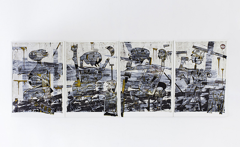 Democracy in Masturbation Period remonstrates against the failures of South African democracy. It has a strong reference to GRAFITTI art, and also shows the influence on Ngobeni’s work of artists like Jean-Michel Basquiat, Dumile Feni and Picasso.