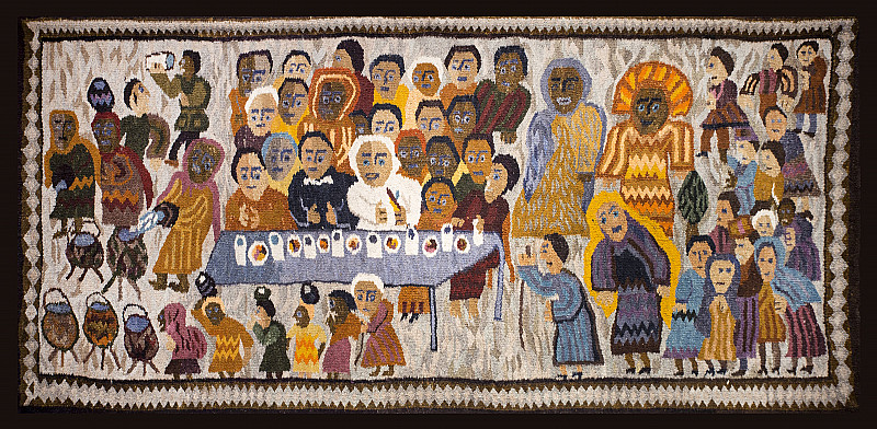 The Marriage Feast at Cana is a TAPESTRY that typifies the approach and output of many weavers and other arts- and craftspeople at Rorke’s Drift. Specifically African in its idiom, it is also a vibrant retelling of a well-known Biblical story from The Book of John, about a wedding feast in which Jesus turns water into wine.