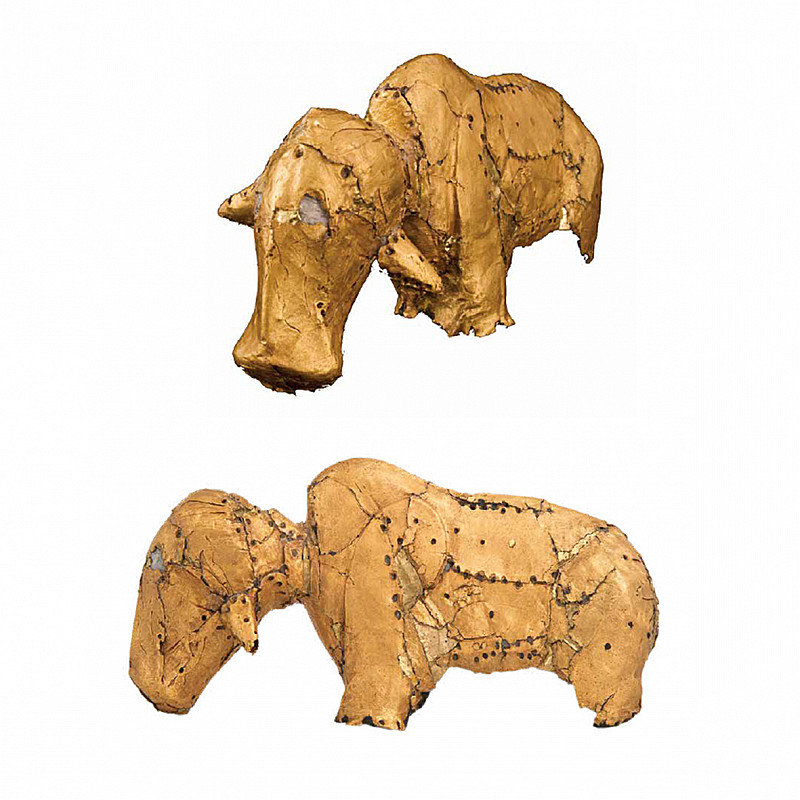 This gold foil figurine of a bovine, probably represents Mapungubwe-type domestic cattle. Similar to the gold rhino, it was originally formed and mounted onto a wooden core that has decayed over time. The facial profile is relatively flat or straight from poll to snout. The figure has down-turned horns (or ears) forming a downward continuation of the curve of the poll and is depicted with a distinctive hump. The bovine has clearly defined fore-limbs and a bulged rump and the head tapers inward and the flares out to form a snout, with decorative folds in the foil, to indicate a clear mouth and nostrils. The eyes are formed by two large perforations (which probably held solid gold nails as eyes).